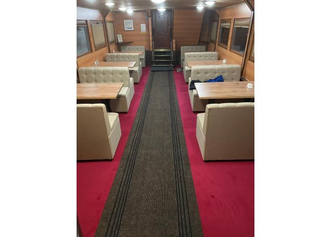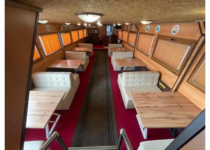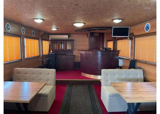 - На главной палубе располагается: уютный банкетный зал. Комфортная банкетная посадка до 30 персон. Банкетный зал оснащен всей необходимой техникой: музыкальный центр, видеотехника.
